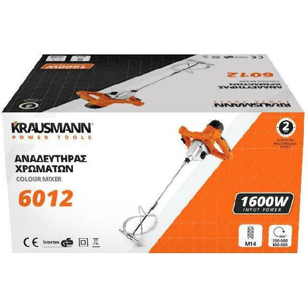 Αναδευτήρας χρωμάτων Krausmann 6012 1600 W, δύο ταχυτήτων (250–500 / 400–800 rpm), με άξονα M14 και ελικοειδές εξάρτημα Ø160 mm. Ιδανικός για βαφές, γύψο, κονιάματα. Βάρος ~5.8 kg