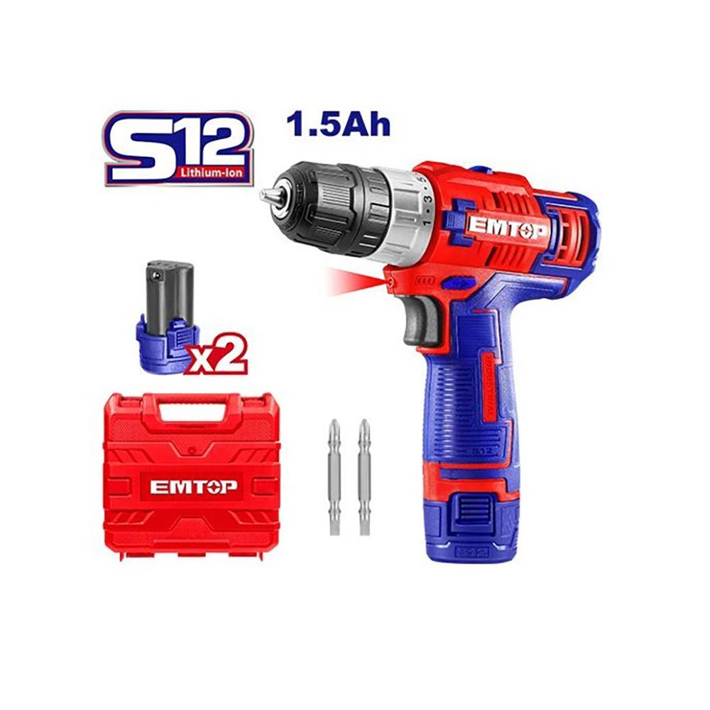 Δραπανοκατσάβιδο μπαταρίας 12V Emtop με 15+1 ρυθμίσεις ροπής, τσοκ 10mm χωρίς κλειδί, 2 ταχύτητες και μπαταρία λιθίου 1500mAh. Ιδανικό για ελαφριές εργασίες.