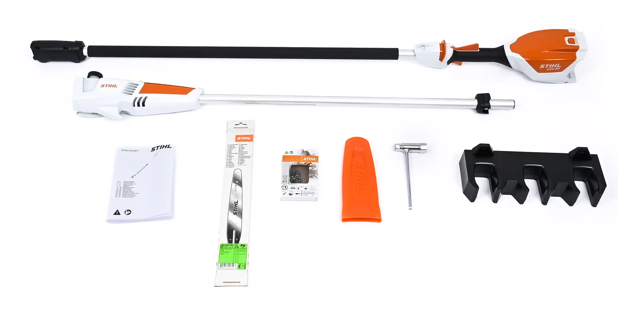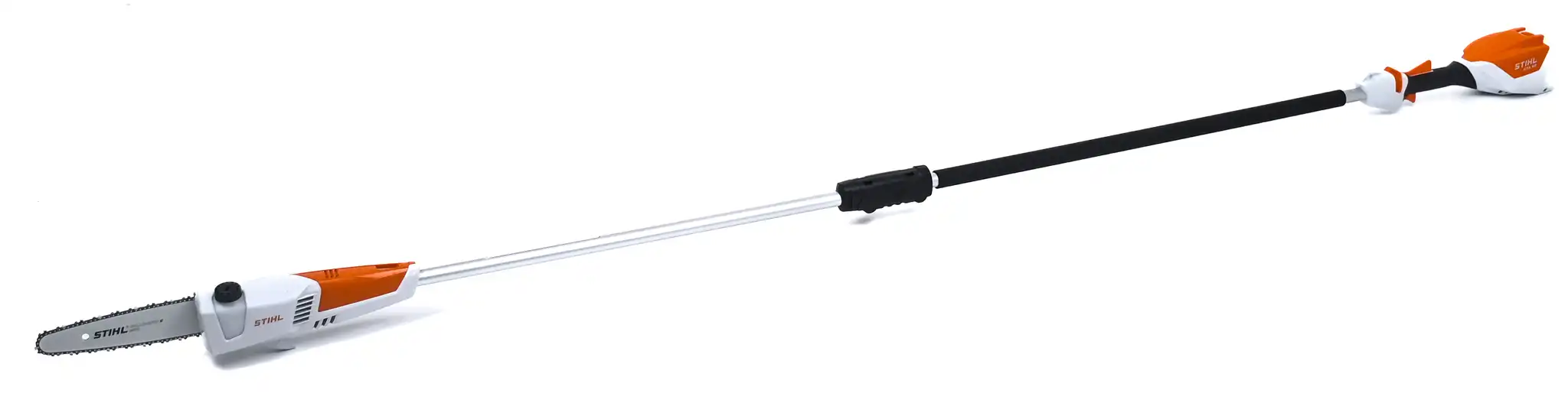 Επαναφορτιζόμενο τηλεσκοπικό αλυσοπρίονο STIHL HTA 50 SOLO με εργονομική λαβή, μήκος έως 280 cm και σύστημα μπαταριών AK, ιδανικό για εύκολη και ασφαλή κοπή κλαδιών.