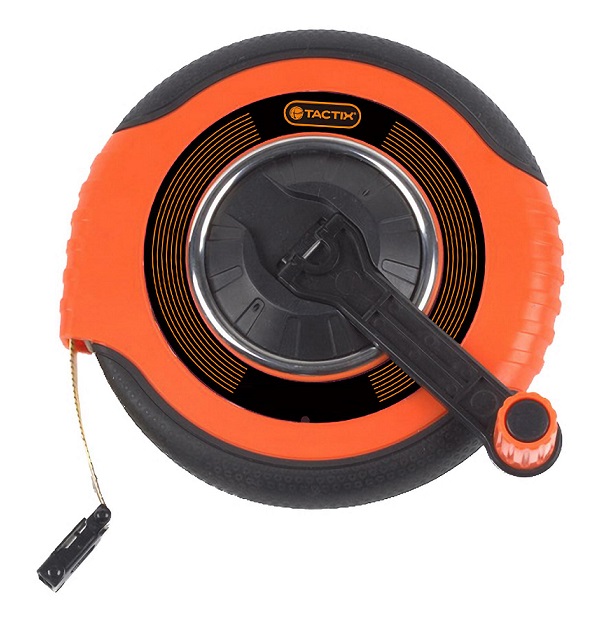 Μετροταινία Fiberglass Tactix 20m x 15mm, με εύκαμπτη και ανθεκτική ταινία από υαλονήματα, εργονομική λαβή και μηχανισμό επαναφοράς. Ιδανική για τεχνικές εργασίες σε εξωτερικό περιβάλλον.