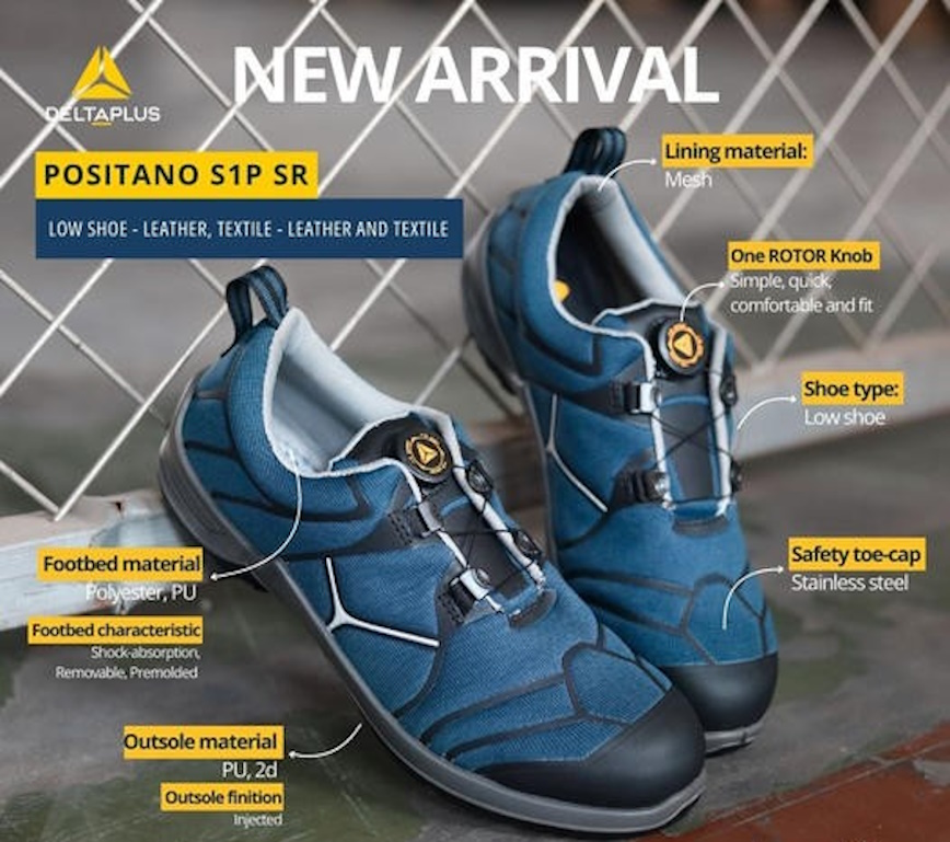 Παπούτσι DeltaPlus Positano S1P μπλε με προστασία δακτύλων, αντιστατική και αντιολισθητική σόλα για ασφάλεια και άνεση σε εργασιακές συνθήκες.