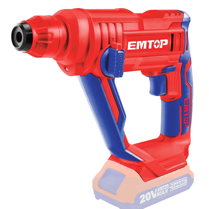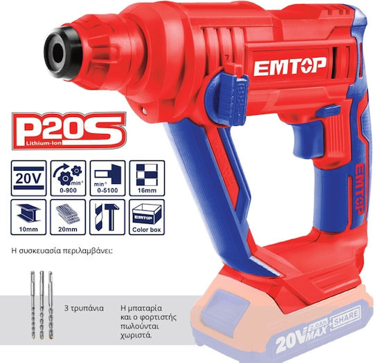 Περιστροφικό κρουστικό πιστολέτο μπαταρίας 20V Emtop με SDS Plus, 900 rpm, 5100 bpm και ενσωματωμένο LED. Ιδανικό για διάτρηση σε μπετόν.