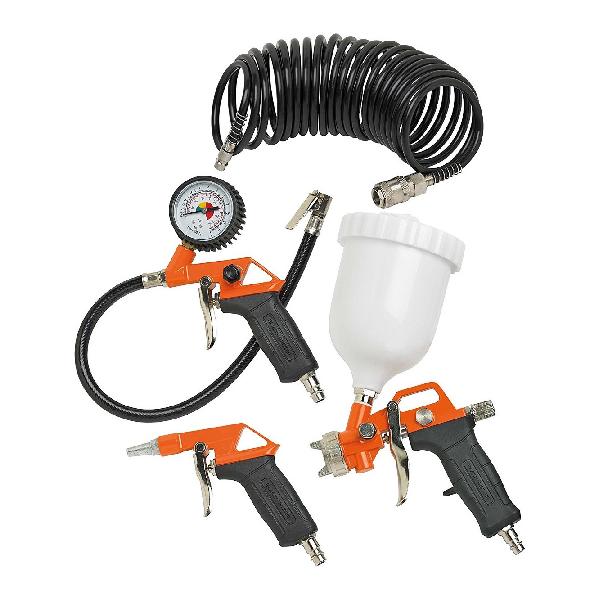 Σετ αέρος Black+Decker 4 τεμαχίων με πιστόλι βαφής άνω δοχείου. Περιλαμβάνει εξαρτήματα για βαφή, φούσκωμα και καθαρισμό. Ιδανικό για εργασίες συντήρησης και DIY εφαρμογές.