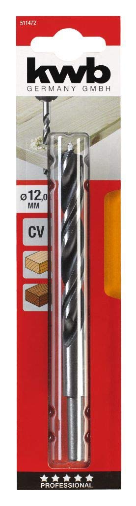 Τρυπάνι ξύλου KWB 12 mm από χάλυβα CV με κεντρική ακίδα και προκοπτήρες, ιδανικό για καθαρές και ακριβείς οπές σε μαλακό και σκληρό ξύλο. Κατάλληλο για δράπανα με στρογγυλή υποδοχή και επαγγελματική χρήση.