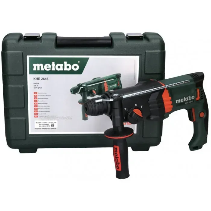 Το Metabo KHE 2645 είναι ένα ηλεκτρικό σκαπτικό περιστροφικό πιστολέτο 850W με υποδοχή SDS-Plus, κατάλληλο για διάτρηση και καλέμισμα σε μπετόν, τοιχοποιία, ξύλο και χάλυβα. Διαθέτει τρεις λειτουργίες: διάτρηση με κρούση, διάτρηση και καλέμισμα.