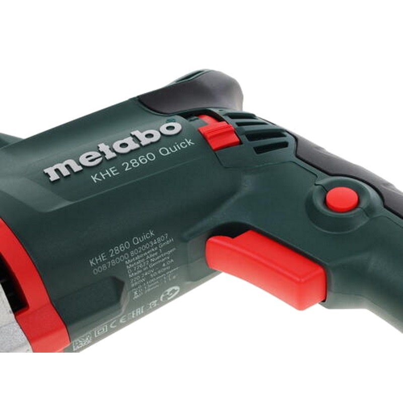 Γωνιακό πιστολέτο Metabo KHE 2860 Quick 880W με διπλό τσοκ για γρήγορη αλλαγή SDS-Plus και τσοκ χωρίς κλειδί, ιδανικό για διάτρηση και καλέμισμα σε μπετόν και ξύλο.