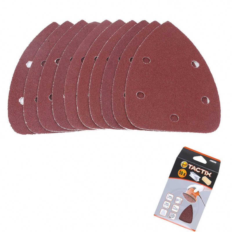 Πατόχαρτα τρίγωνα Velcro Tactix 140x140x95 mm Νο80, σετ 10 τεμ., ιδανικά για λείανση μεσαίας τραχύτητας σε ξύλο και μέταλλο με εύκολη εφαρμογή.