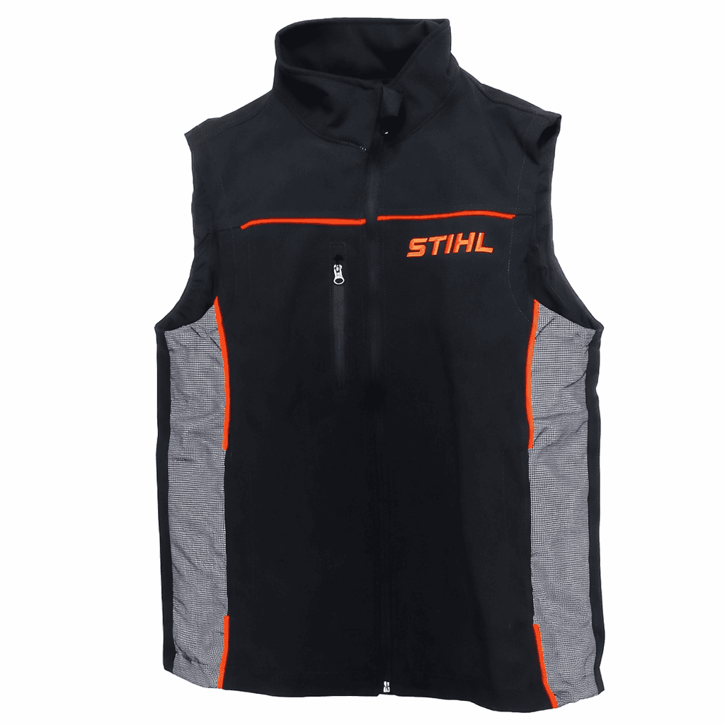 Softshell αμάνικο γιλέκο STIHL σε μαύρο-πορτοκαλί, ανθεκτικό και άνετο, ιδανικό για προστασία και ελευθερία κινήσεων σε εργασίες υπαίθρου.