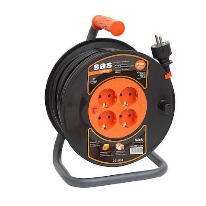 Ο πλαστικός στροφέας μπαλαντέζας SAS διαθέτει καρούλι 25 m με καλώδιο 3×1.5 mm², ιδανικός για ασφαλή και τακτοποιημένη διαχείριση καλωδίων σε εσωτερικούς και εξωτερικούς χώρους, προσφέροντας αντοχή και ευκολία στη χρήση.