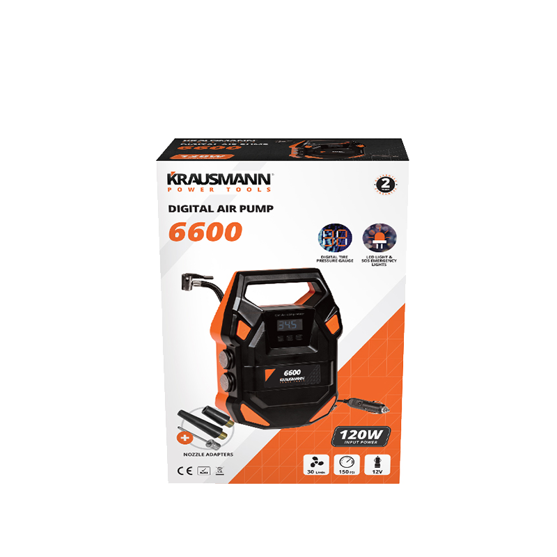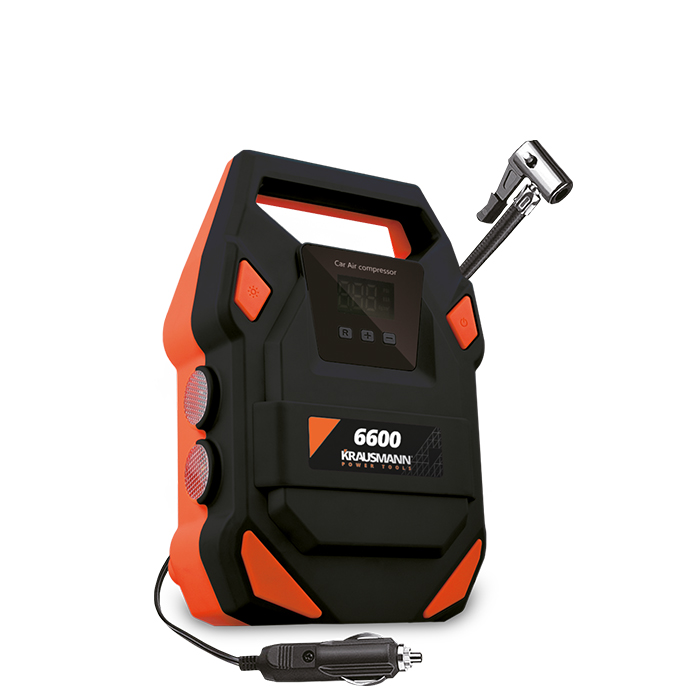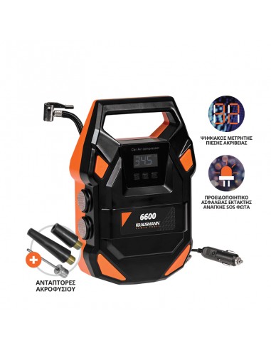 Ο ψηφιακός αεροσυμπιεστής KRAUSMANN 6600 λειτουργεί με 12V και φτάνει τα 150psi. Διαθέτει οθόνη και αυτόματη διακοπή λειτουργίας για ακριβές φούσκωμα ελαστικών αυτοκινήτου, ποδηλάτου και άλλων αντικειμένων.