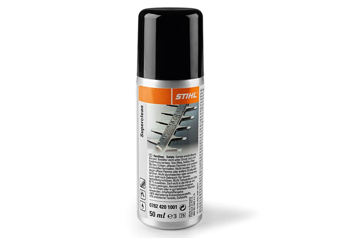 Το διαλυτικό ρητίνης STIHL καθαρίζει αποτελεσματικά υπολείμματα ρητίνης, βρωμιάς και λαδιών από λάμες, αλυσίδες και εργαλεία κοπής. Βελτιώνει τη λειτουργία του εξοπλισμού και παρατείνει τη διάρκεια ζωής του. Διατίθεται σε συσκευασίες 300ML και 50ML.
