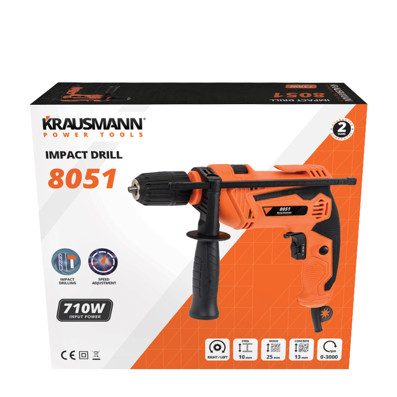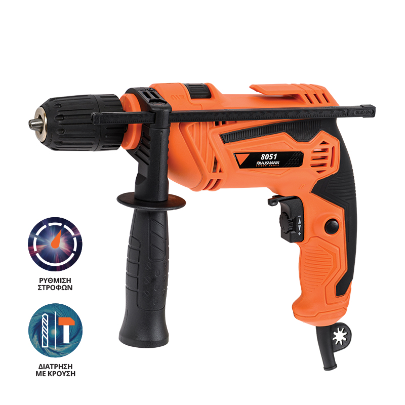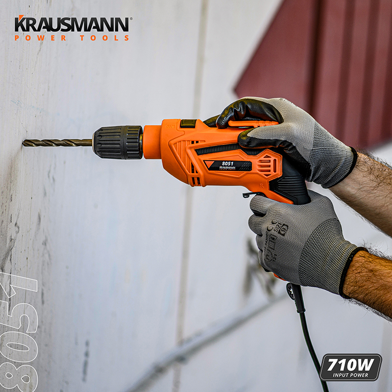 Ηλεκτρικό κρουστικό δράπανο Krausmann 8051 με ισχύ 710W, αυτόματο τσοκ 13mm, ρυθμιζόμενη ταχύτητα έως 3000 rpm, επιλογή δεξιάς/αριστερής περιστροφής, κατάλληλο για διάτρηση σε μπετόν, ξύλο και μέταλλο.