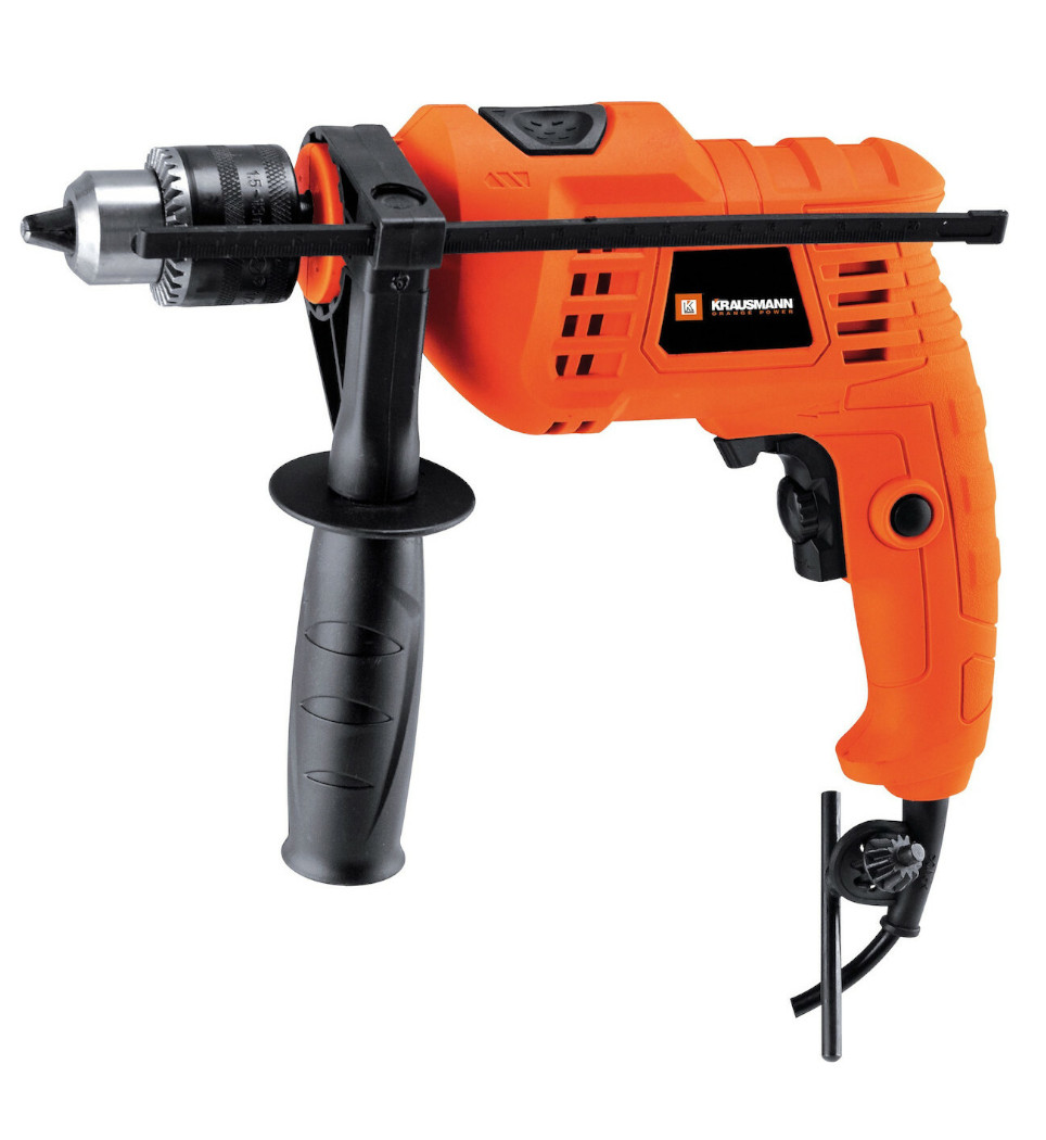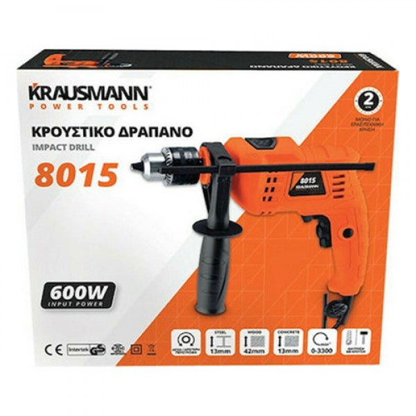 Ηλεκτρικό κρουστικό δράπανο Krausmann 8015 με 600 watt, 13mm τσοκ, ρυθμιζόμενη ταχύτητα, λειτουργία κρούσης και εναλλαγή περιστροφής, ιδανικό για μπετό, πέτρα, ξύλο και μέταλλο με εργονομική χειρολαβή.