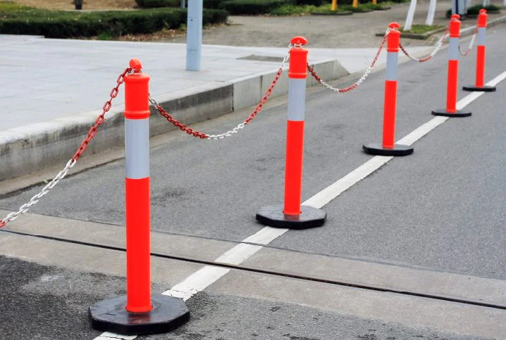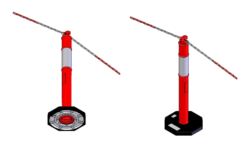 Κολώνα αλυσίδας πολυαιθυλενίου ύψους 115 cm με σωλήνα διαμέτρου 100 mm και μαύρη λαστιχένια βάση διαμέτρου 400 mm βάρους 8.5 kg για σταθερή στήριξη. Ιδανική για οριοθέτηση και σήμανση χώρων.