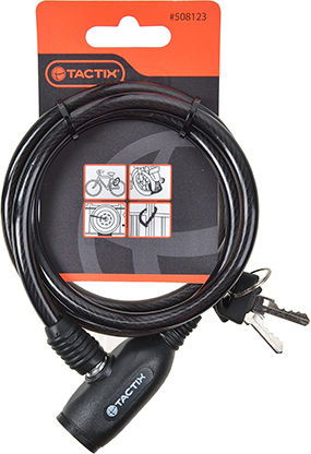 Ατσάλινο λουκέτο ποδηλάτου Tactix με ανθεκτικό σύρμα πάχους 8mm και μήκους 1200mm. Διαθέτει κλείδωμα με κλειδί για αξιόπιστη προστασία, προσφέροντας στιβαρή και πρακτική λύση για καθημερινή χρήση και ασφαλή στάθμευση του ποδηλάτου σου.