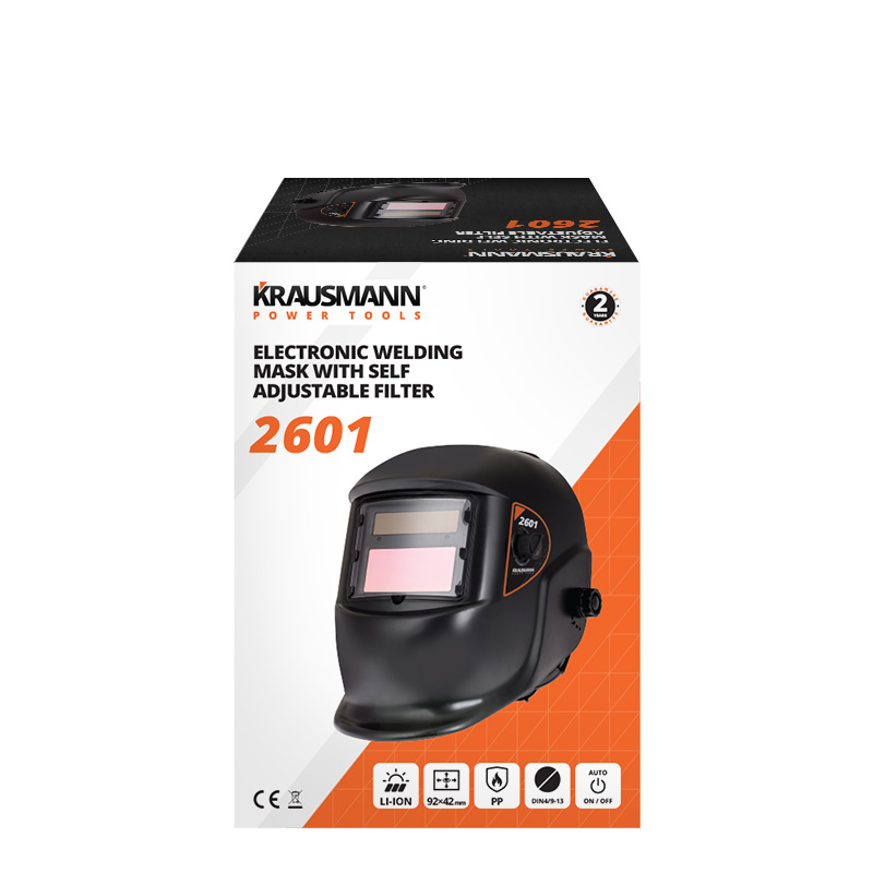 Η ηλεκτρονική μάσκα συγκόλλησης KRAUSMANN 2601 διαθέτει αυτόματη ρύθμιση σκίασης, προσφέρει προστασία από ακτινοβολία UV/IR και αυξάνει την άνεση κατά τη διάρκεια εργασιών συγκόλλησης.