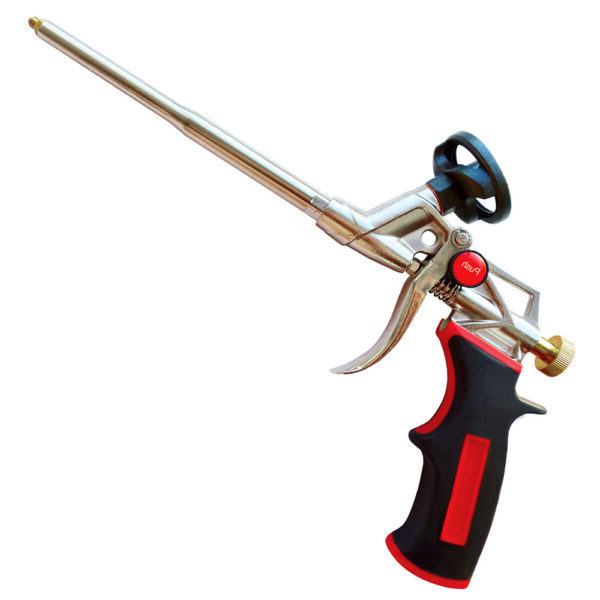 Μεταλλικό πιστόλι πολυουρεθάνης με ρυθμιζόμενη ροή για ακριβή εφαρμογή αφρού σε μονώσεις, αρμούς και κατασκευαστικές εργασίες. Κατάλληλο για επαγγελματική χρήση.