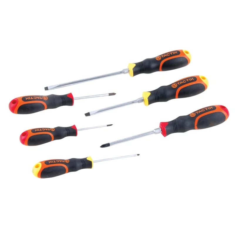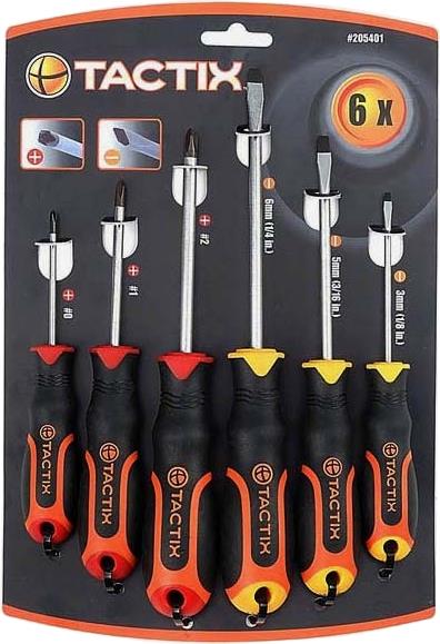 Σετ κατσαβίδια Tactix 6 τεμαχίων τύπου PH και ίσια. Κατασκευασμένα από ανθεκτικό χάλυβα CR-V με εργονομικές λαβές για άνετο και ασφαλές κράτημα. Ιδανικά για τεχνικές και οικιακές εργασίες.