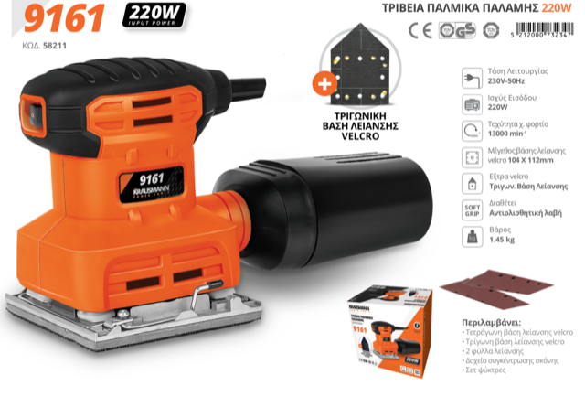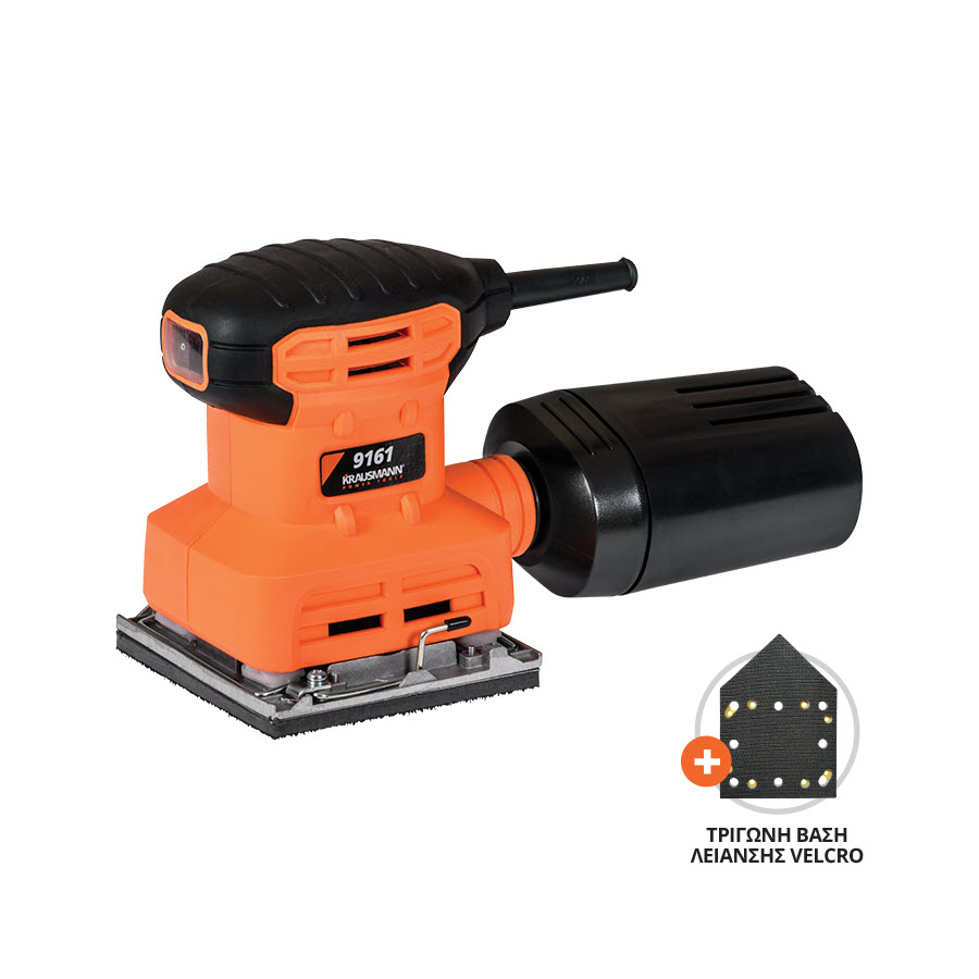 Krausmann 9161 είναι ένα παλμικό τριβείο παλάμης 220W, ιδανικό για λείανση και στίλβωση σε δύσκολα προσβάσιμες περιοχές. Διαθέτει τετράγωνη και τρίγωνη βάση λείανσης τύπου Velcro, σύστημα αναρρόφησης σκόνης