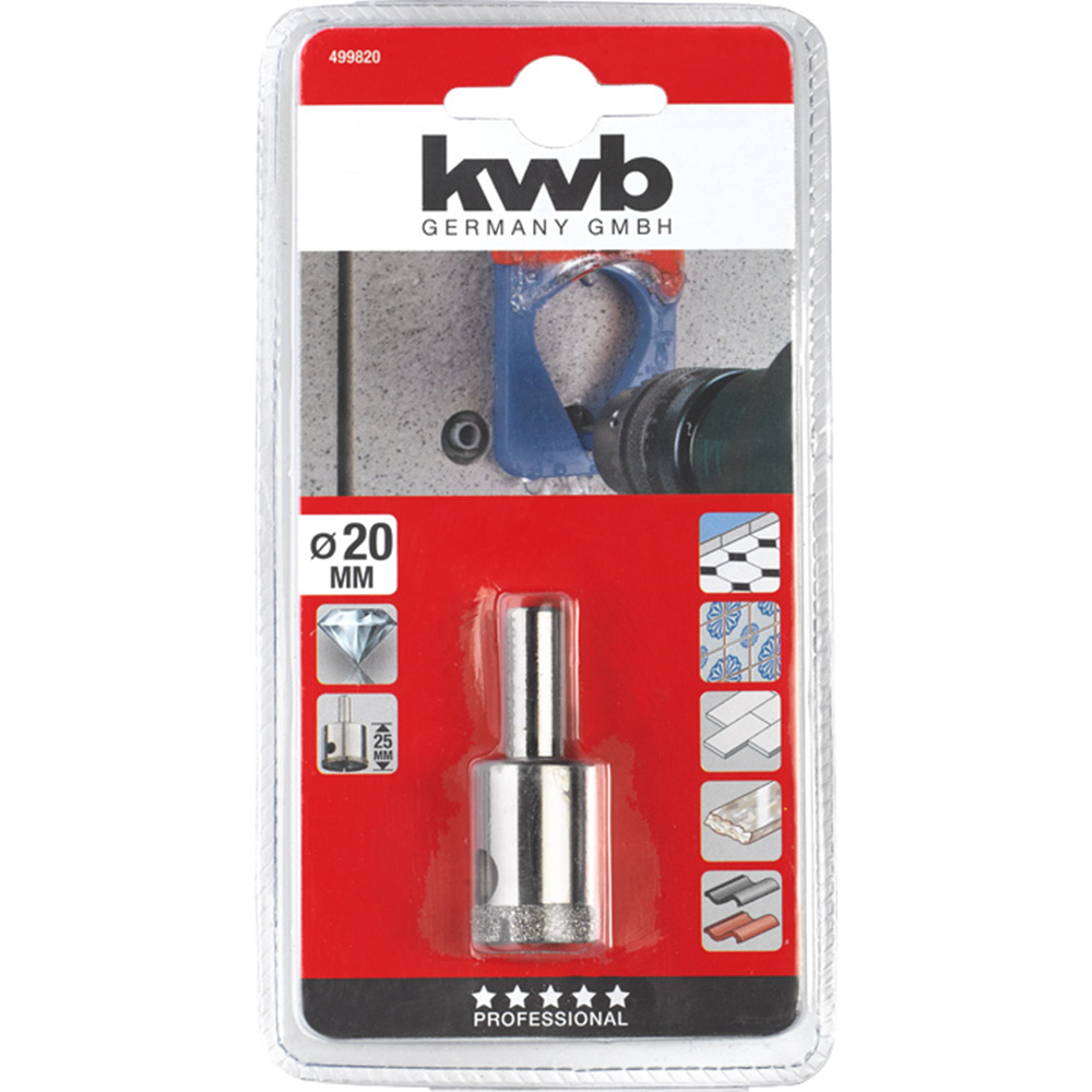 Ποτηροτρύπανο διαμαντένιο KWB 499820 διαμέτρου 20 mm, ιδανικό για υγρή κοπή σε πλακίδια, πορσελάνη και γρανίτη. Προσφέρει υψηλή ακρίβεια, καθαρή κοπή και μεγάλη αντοχή για επαγγελματικές εφαρμογές.