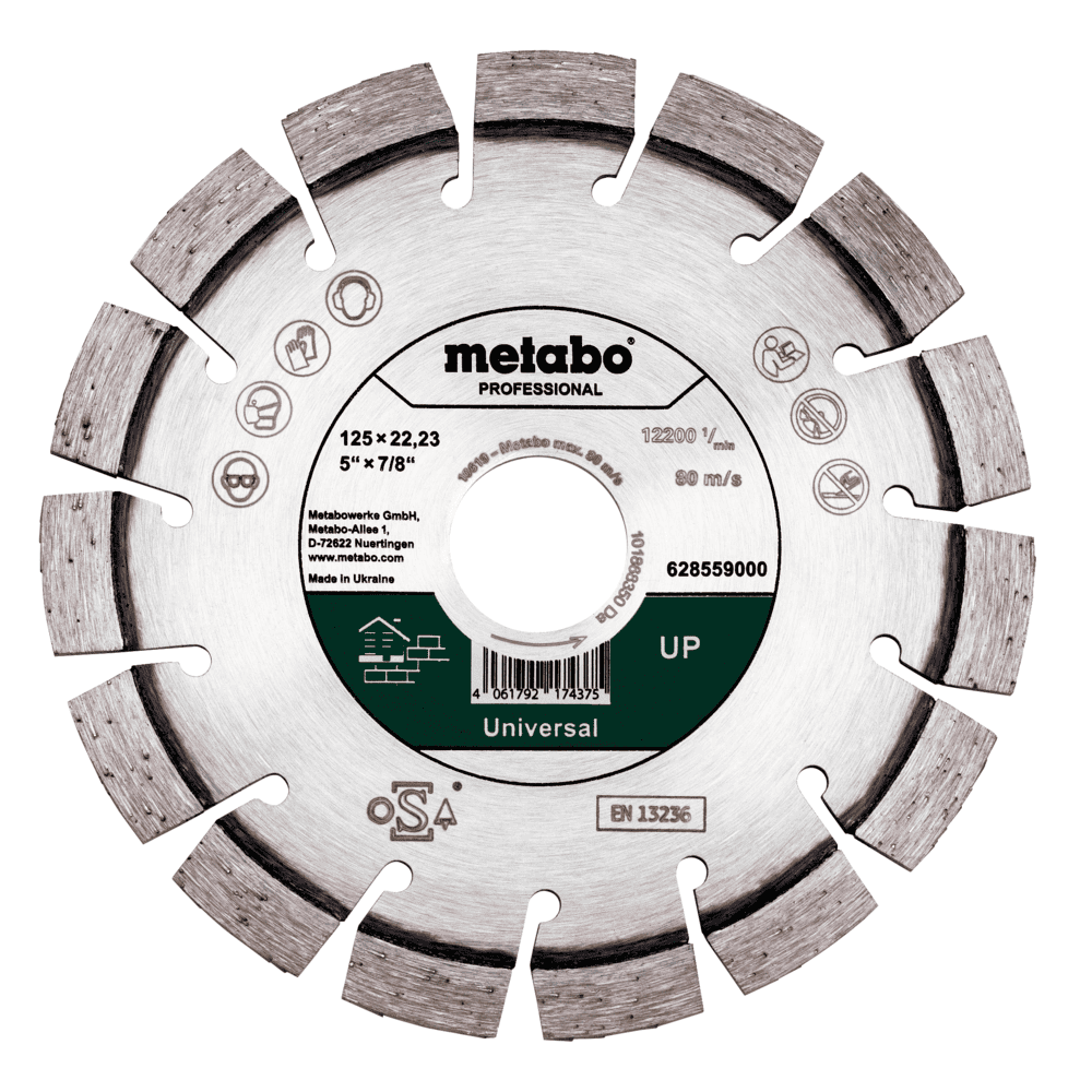 Ο δίσκος κοπής με διαμάντι 125×22,23mm UP Universal 628559000 Metabo προσφέρει υψηλή ακρίβεια και ανθεκτικότητα, ιδανικός για κοπή πέτρας, μπετόν, πλακιδίων και άλλων σκληρών υλικών με επαγγελματικό αποτέλεσμα.