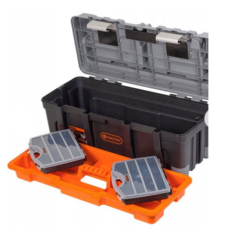 Διάφανη εργαλειοθήκη Tactix 66×30×28 cm (320312) με ράφι, 2 ταμπακιέρες και μεταλλικά κλιπς – ανθεκτική, ευρύχωρη και ιδανική για οργανωμένη αποθήκευση και μεταφορά εργαλείων.