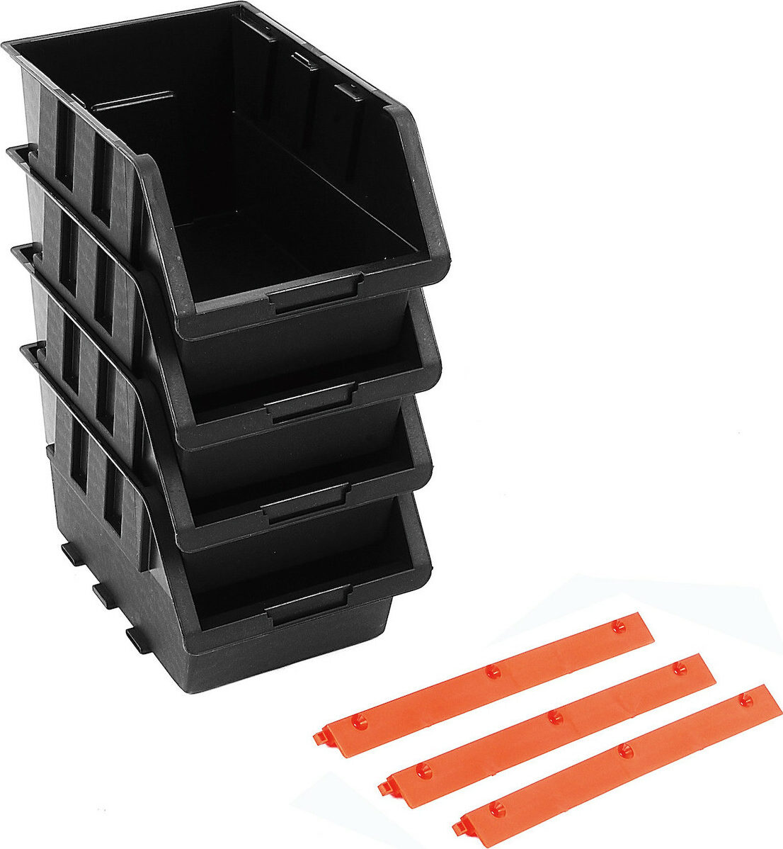 Σετ σκαφάκια Tactix 4 τεμαχίων με 3 ράγες τοποθέτησης, διαστάσεων 15x24x12.8cm. Ιδανικό για οργάνωση εξαρτημάτων σε εργαστήριο, αποθήκη ή γκαράζ, με στιβαρή κατασκευή και πρακτικό σχεδιασμό.