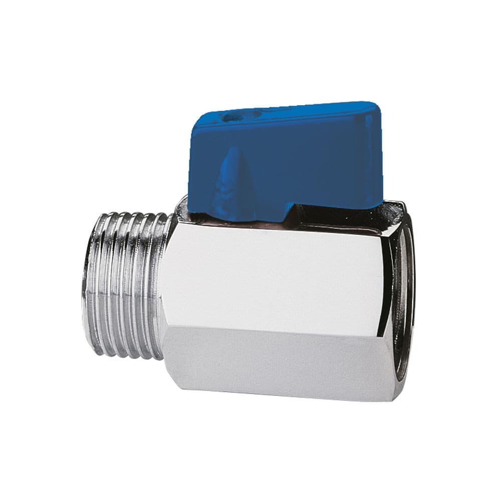 Σφαιρικός κρουνός mini 1/2 αρσενικό-θηλυκό με μπλε χερούλι, κατάλληλος για παροχές νερού σε οικιακές και επαγγελματικές εγκαταστάσεις, με συμπαγή κατασκευή και εύκολη χρήση.