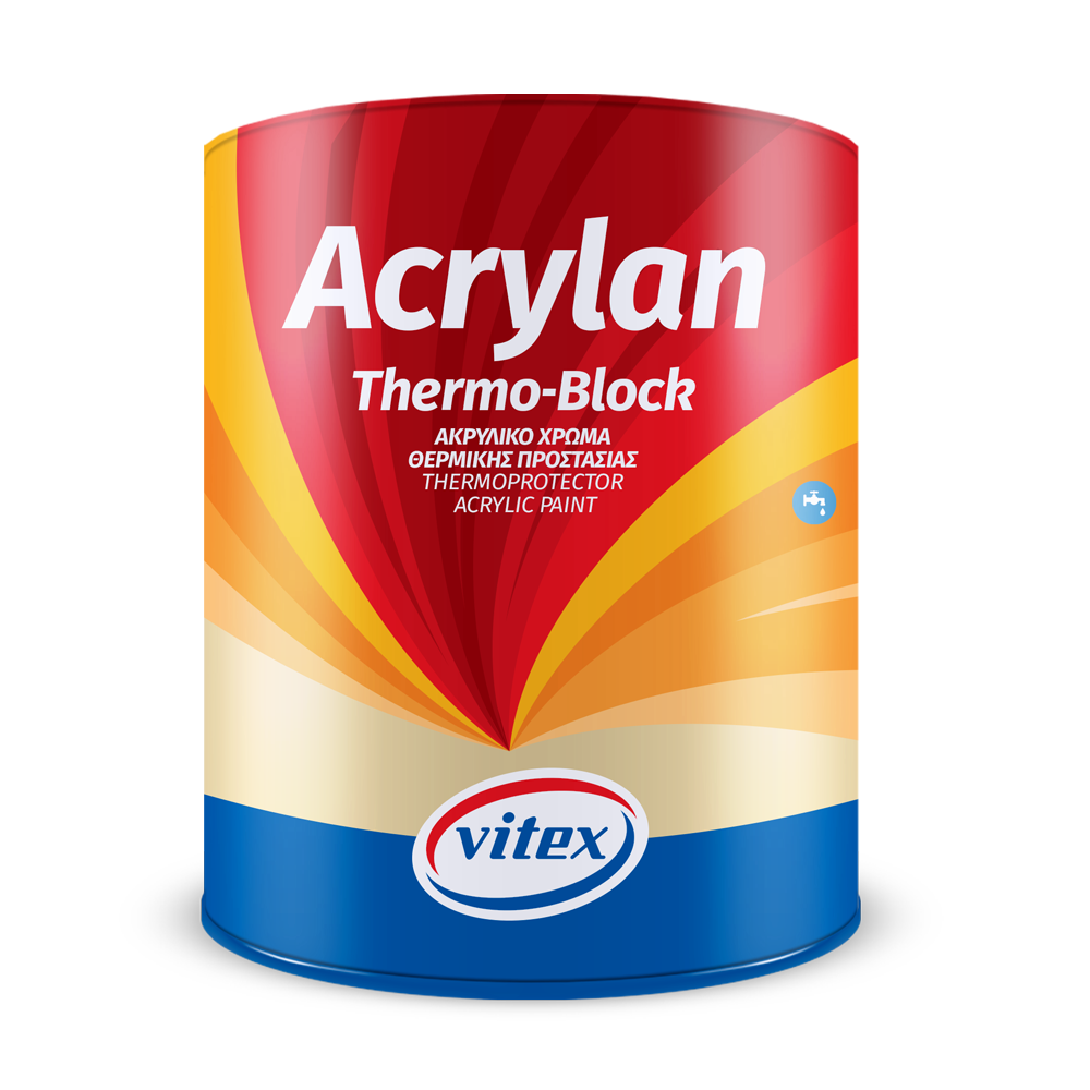 Vitex Acrylan Thermo-Block λευκό 10L, ακρυλικό θερμομονωτικό χρώμα εξωτερικής χρήσης. Προστατεύει από υγρασία, UV και ακραίες καιρικές συνθήκες, μειώνει θερμοκρασία εσωτερικών χώρων και στεγανοποιεί επιφάνειες.