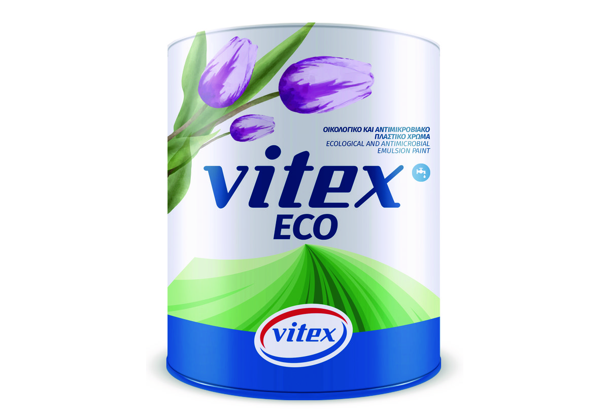 Χρώμα πλαστικό Vitex Eco λευκό, οικολογικό με χαμηλές οσμές, υψηλή καλυπτικότητα και αντοχή, κατάλληλο για εσωτερικές επιφάνειες με ματ φινίρισμα και εύκολη εφαρμογή.